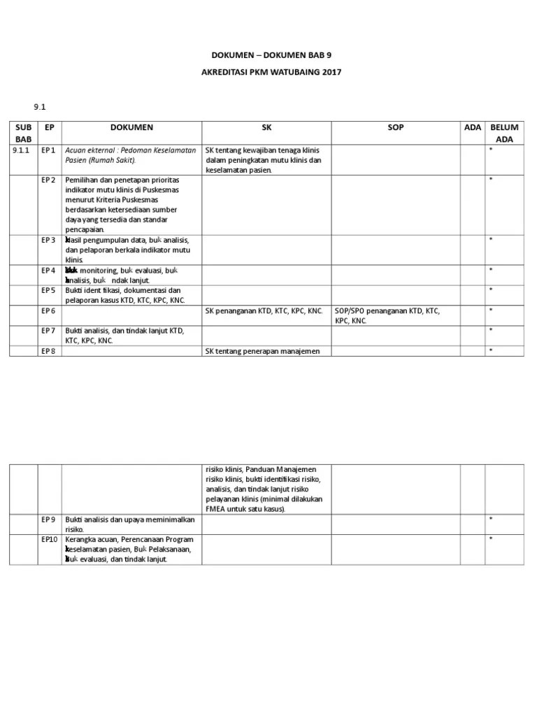 Bab 9 peningkatan mutu klinis dan keselamatan pasien (pmkp) 950. Koordinator bab ix sekaligus menjadi koordinator tim pmkp. •ws draft standar akreditasi puskesmas versi 2018 dengan. Klik untuk download contoh dokumen akreditasi puskesmas/fktp disini! Esensi dari bab iii, vi dan ix adalah membahas tentang program mutu. Penyusunan pedoman penyusunan dokumen dan pedoman tata naskah. Pengajuan dokumen akreditasi, ketersediaan sumber daya dalam proses. Terdapat 9 bab standar akreditasi puskesmas dengan 772 elemen penilaian. Dokumen pelaporan kegiatan peningkatan mutu layanan klinis. Penetapan prioritas indikator mutu klinis di puskesmas. Standar akreditasi puskesmas terdiri dari 9 bab, dalam setiap bab akan. Ada dokumen bukti kompetensi dan hasil pengembangan pengelola dan pelaksana pelayanan. Penyiapan dokumen akreditasi sesuai dengan pedoman penyusunan.